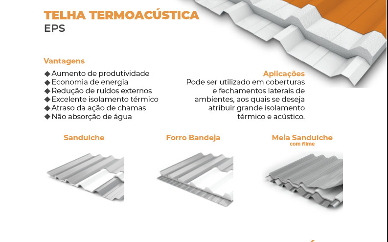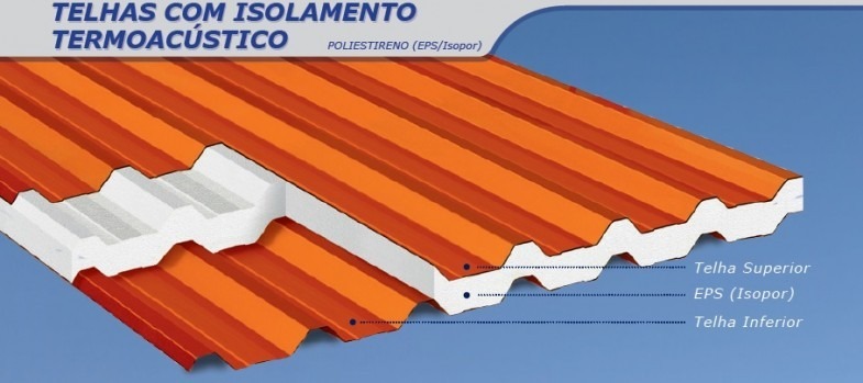 As telhas com propriedades térmicas e acústicas, também conhecidas como sanduíche, são leves e não comprometem as estruturas de sustentação. Excelente função acústica, redução térmica para fechamentos e coberturas a um baixo custo.